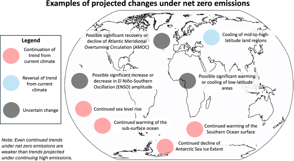 Projected significant global and regional climate changes under net zero emissions. Red circles represent projected changes that are continuations of current trends (albeit at slower rates), blue circles represent projected changes suggesting reversals of current trends, and grey circles represent uncertain changes where there is model disagreement. These are trends expected over decades to centuries under net zero pathways. From King et al. (2025)